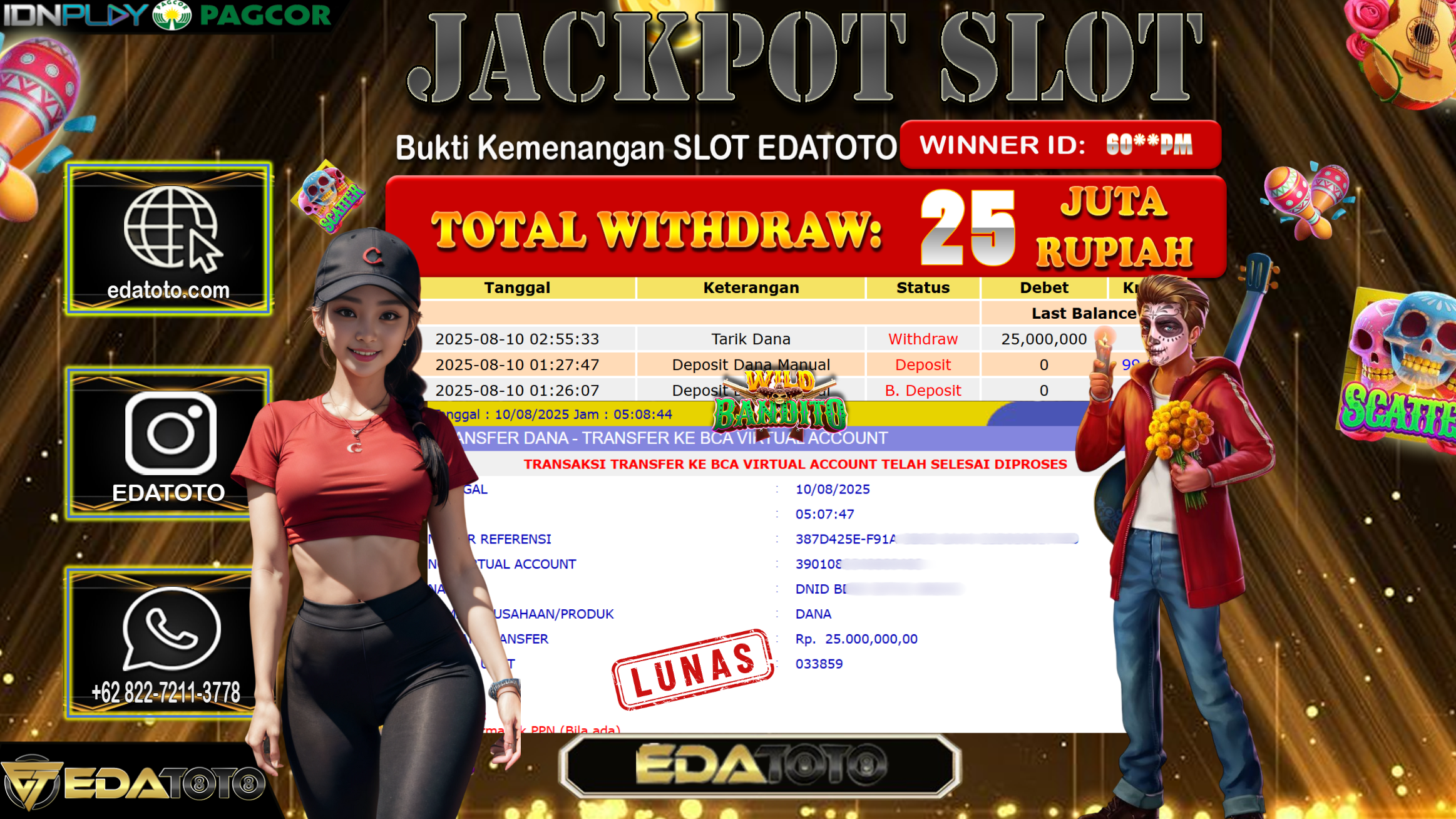 Selamat Kepada Pemilik user ID : 60***pm Hari/Tanggal : Minggu/ 10, Agustus 2025 Jackpot : Rp. 25.000.000 JT Permainan : . . .