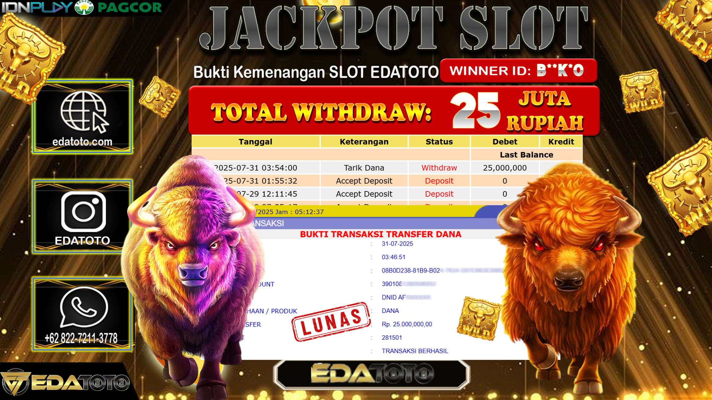Selamat Kepada Pemilik user ID : B**K*0 Hari/Tanggal : Kamis/ 31, Juli 2025 Jackpot : Rp. 25.000.000 JT Permainan : Buffalo . . .
