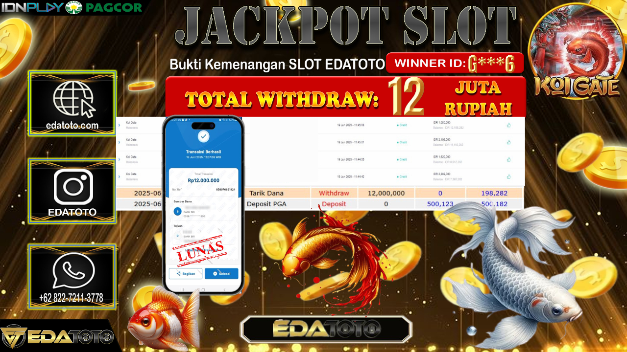Selamat Kepada Pemilik user ID : G***6 Hari/Tanggal : Jum’at/ 20, Juni 2025 Jackpot : Rp. 12.000.000 JT Permainan : Koi . . .