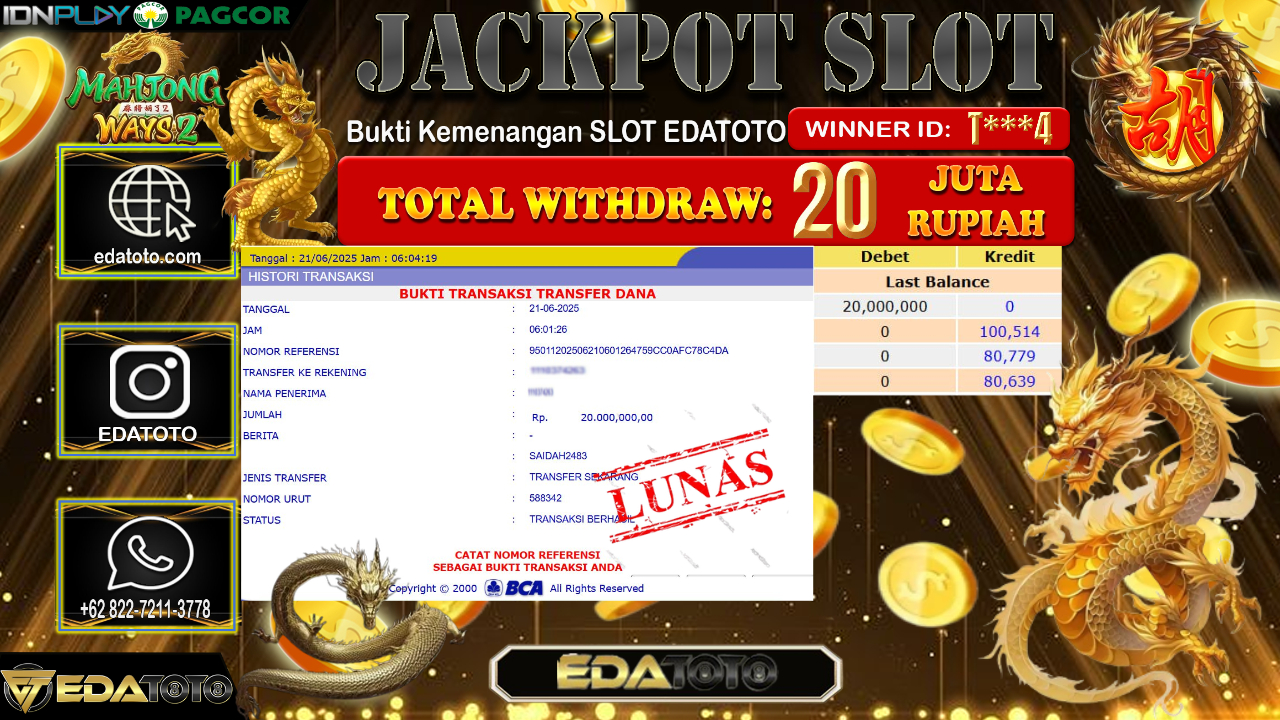 Selamat Kepada Pemilik user ID : T***4 Hari/Tanggal : Sabtu/ 21, Juni 2025 Jackpot : Rp. 20.000.000 JT Permainan : Mahjong . . .