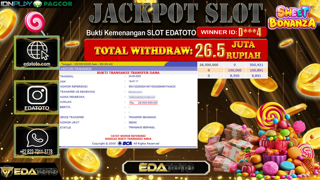 Selamat Kepada Pemilik user ID : D***4 Hari/Tanggal : Minggu/ 25, Mei 2025 Jackpot : Rp. 26.500.000 JT Permainan : Sweet . . .