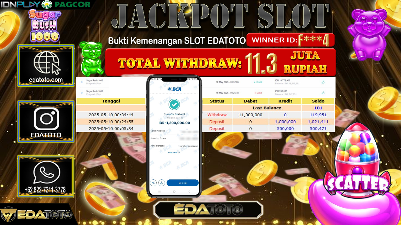 Selamat Kepada Pemilik user ID : F***4 Hari/Tanggal : Sabtu/ 10, Mei 2025 Jackpot : Rp. 11.300.000 JT Permainan : Sugar . . .