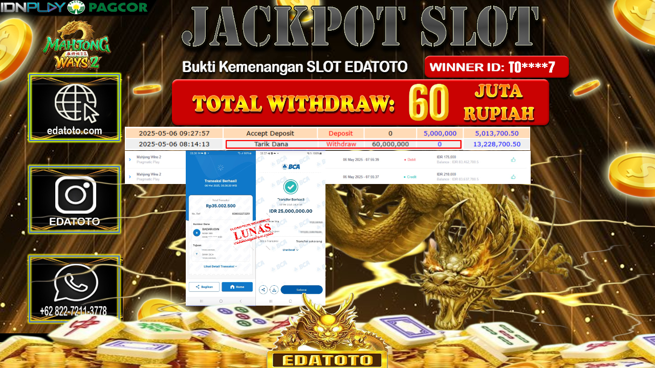 Selamat Kepada Pemilik user ID : TO****7 Hari/Tanggal : Rabu/ 07, Mei 2025 Jackpot : Rp. 60.000.000 JT Permainan : MAHJONG . . .