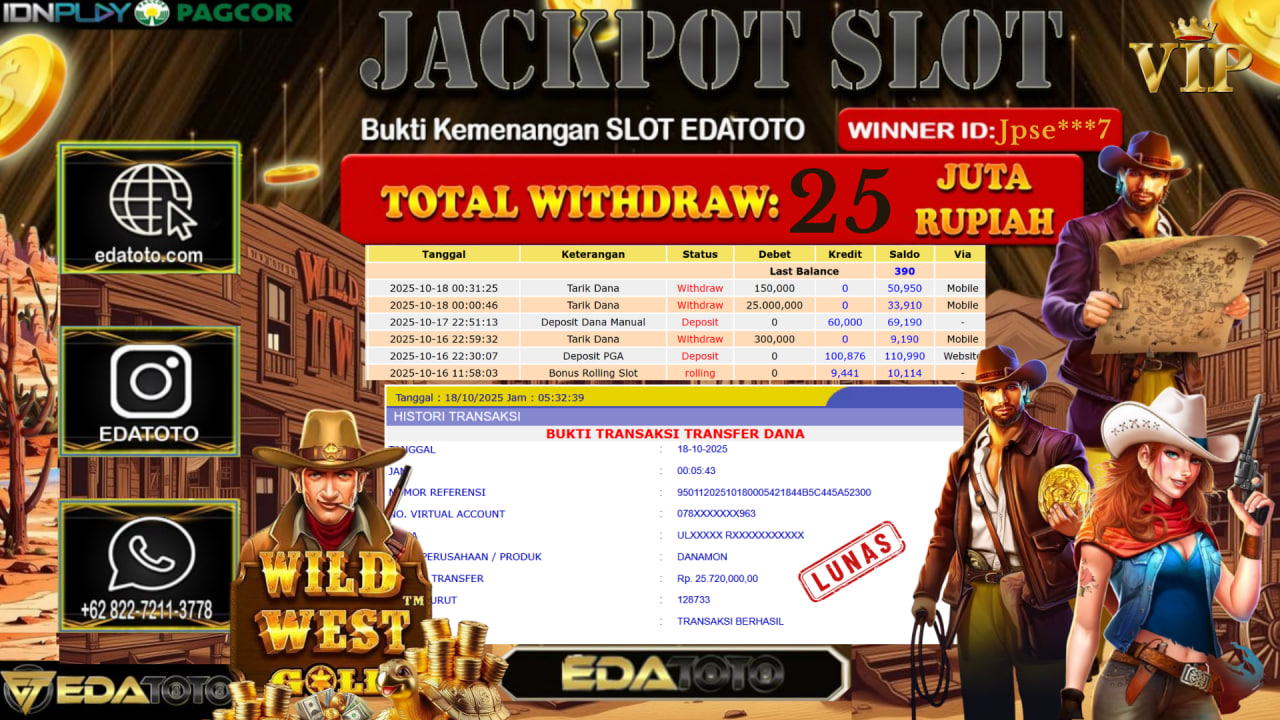 Selamat Kepada Pemilik user ID : Egy6** Hari/Tanggal : Sabtu / 25, Oktober 2025 Jackpot : Rp. 11.000.000 JT Permainan . . .